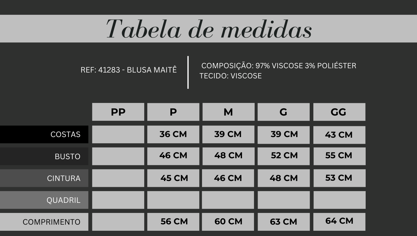 GG: costas 43cm | busto: 55cm | cintura: 53cm | comprimento: 64cm.