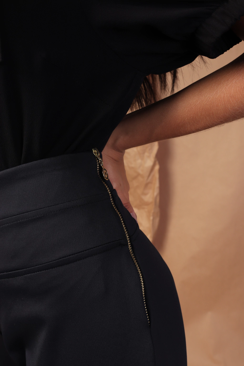 Seu design moderno conta com corte reto, que garante versatilidade para diversas ocasiões, desde o ambiente de trabalho até encontros casuais. O cós ajustado proporciona firmeza, enquanto os detalhes sutis agregam sofisticação ao visual.
