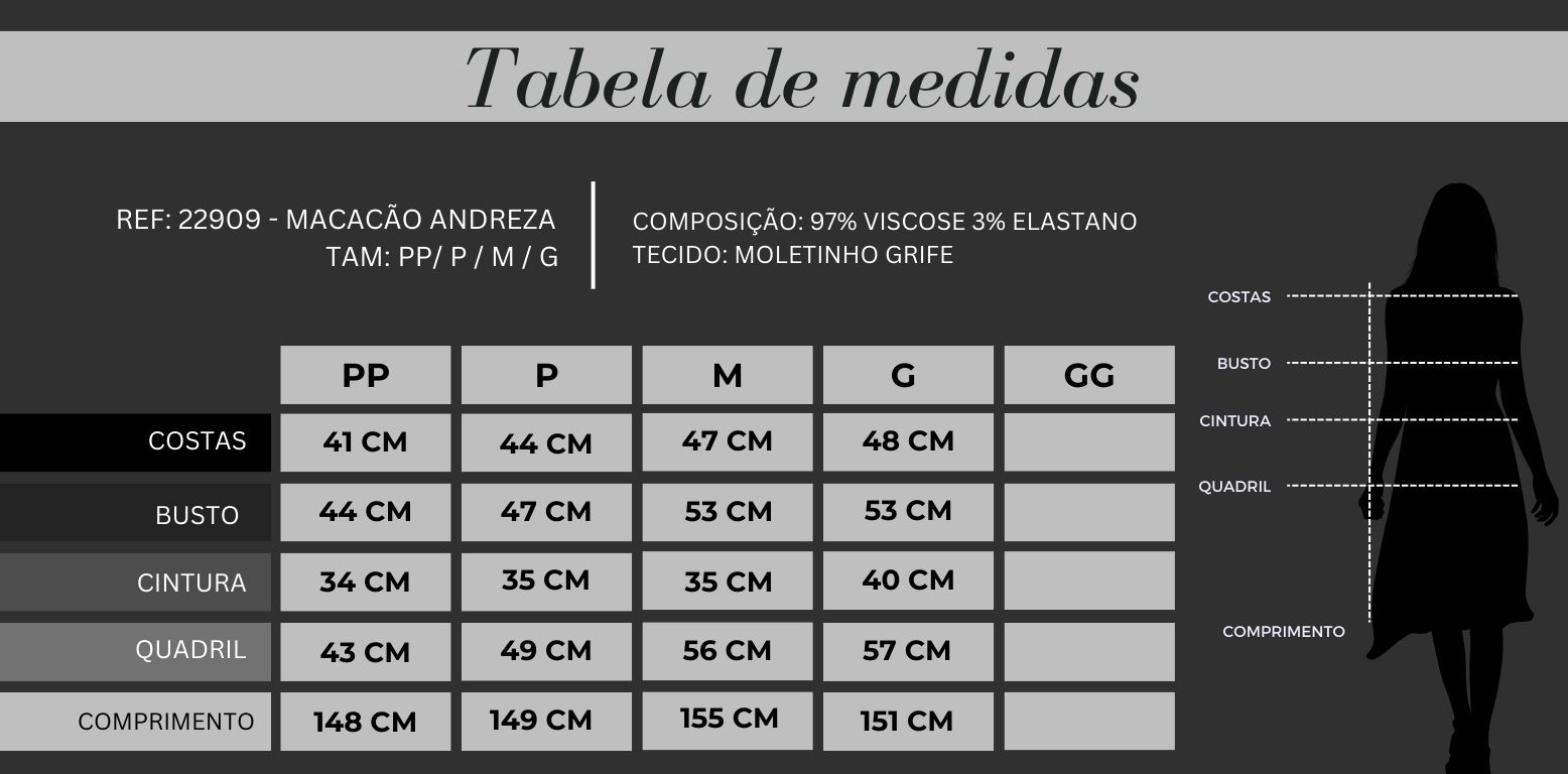 G: Costas 48cm | Busto 53cm | Cintura 40cm | Quadril 57cm | Comprimento 151cm.
